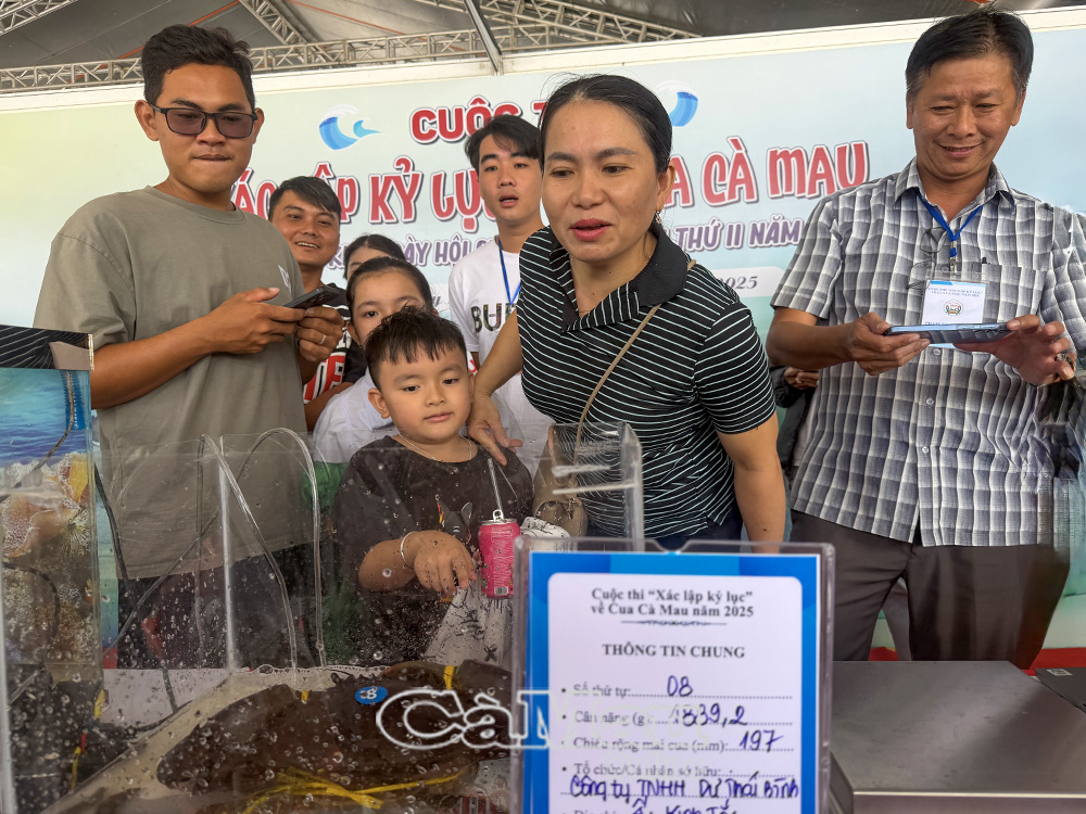 Cá thể cua có trọng lượng gần 1,9 kg xuất hiện, phá kỷ lục tạm thời tại cuộc thi “Xác lập kỷ lục” về cua Cà Mau.