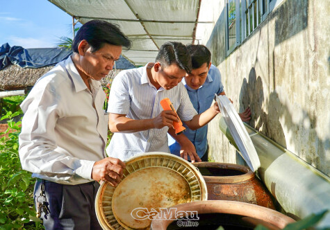 Kiểm tra các dụng cụ chứa nước để diệt lăng quăng tại xã Đầm Dơi.